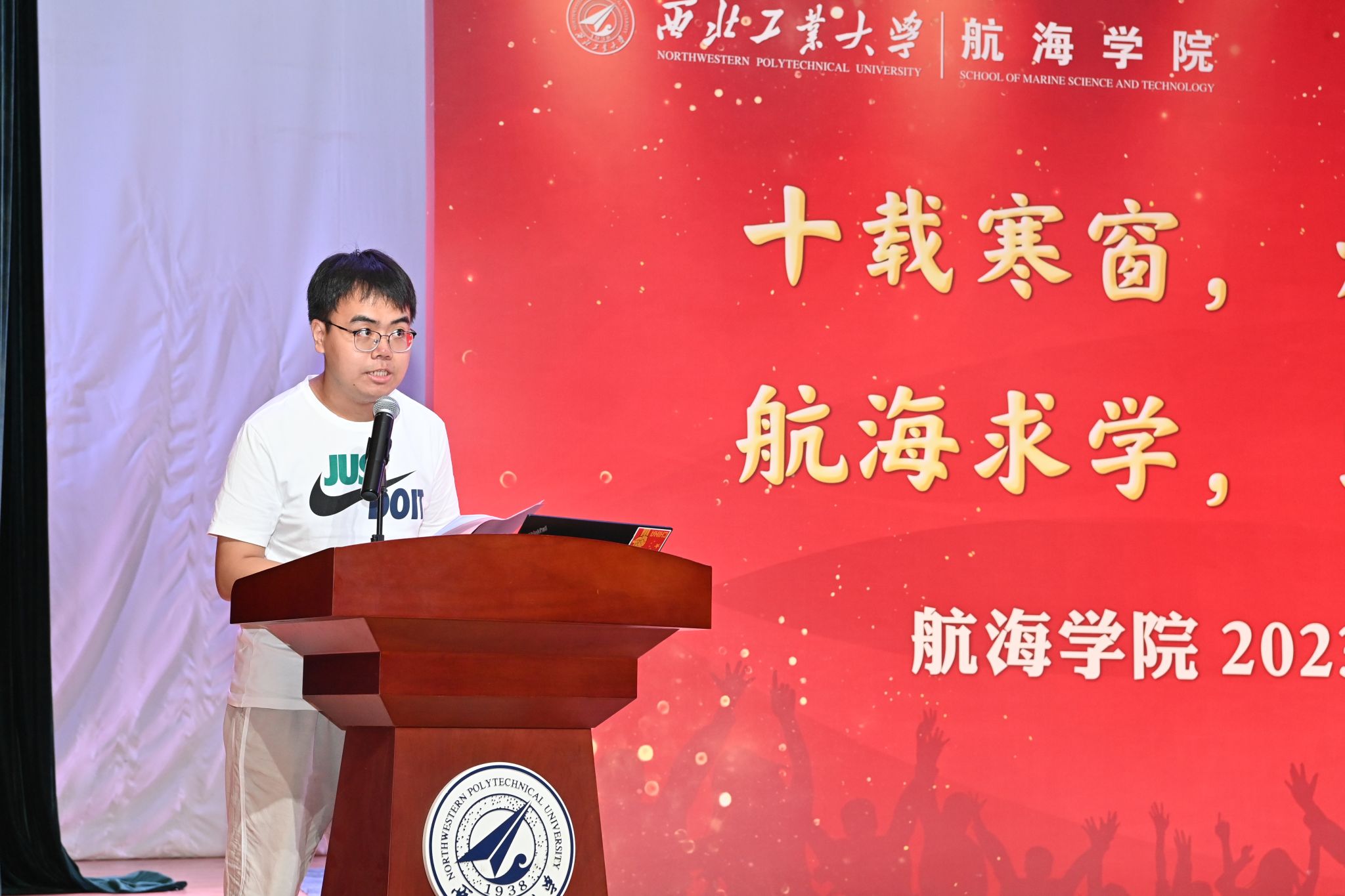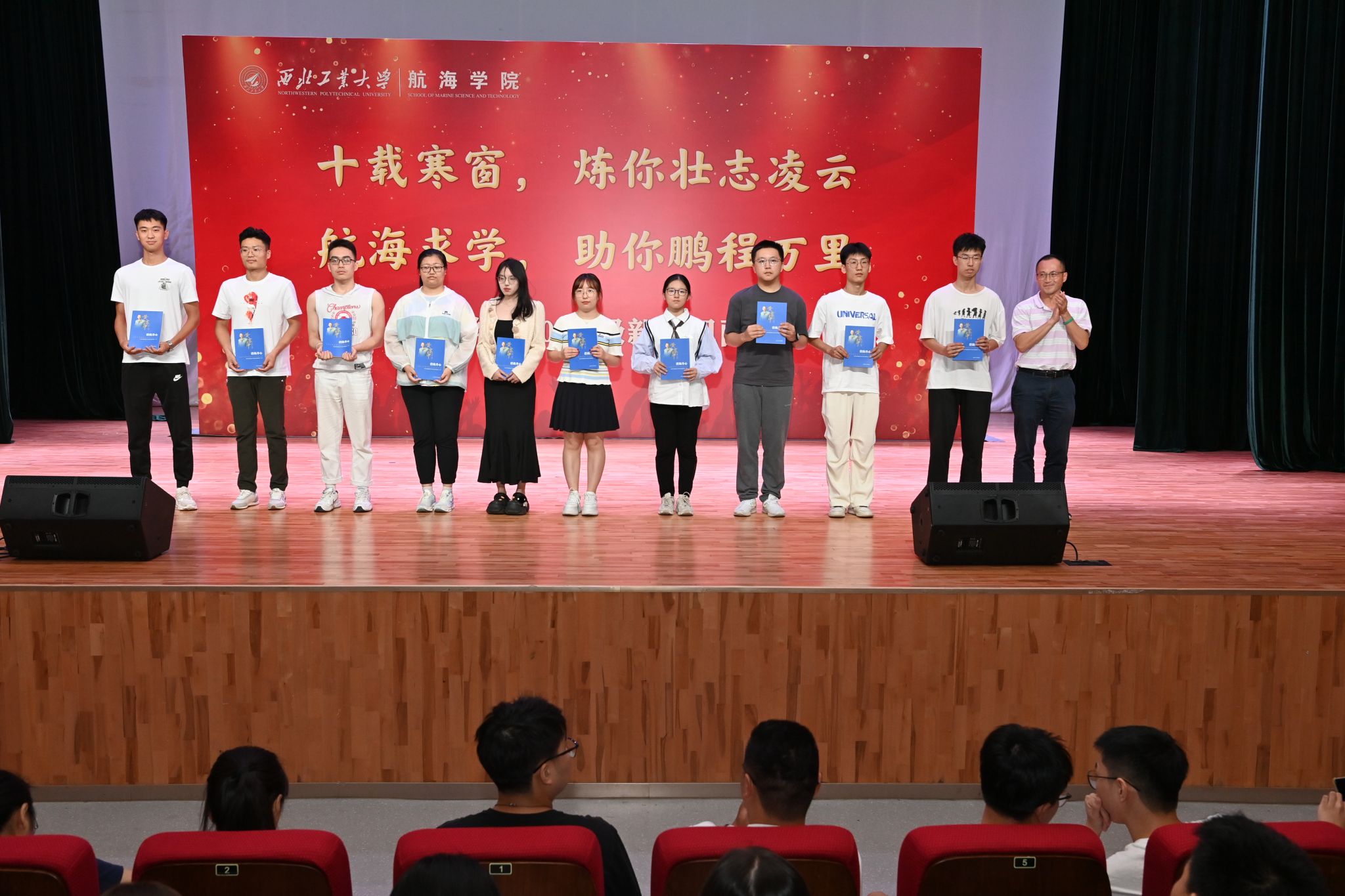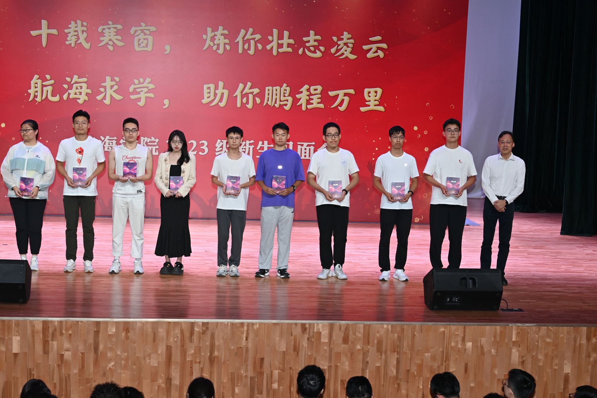 在新生见面会赠送书籍环节,潘光院长和孙华强书记向新生代表赠送了《三体》与《碧海丹心》,希望通过这两本书告诫同学们在大学期间广泛涉猎知识、开拓视野,同时不忘历史,学习并传承航海精神,早日成为国家的栋梁。