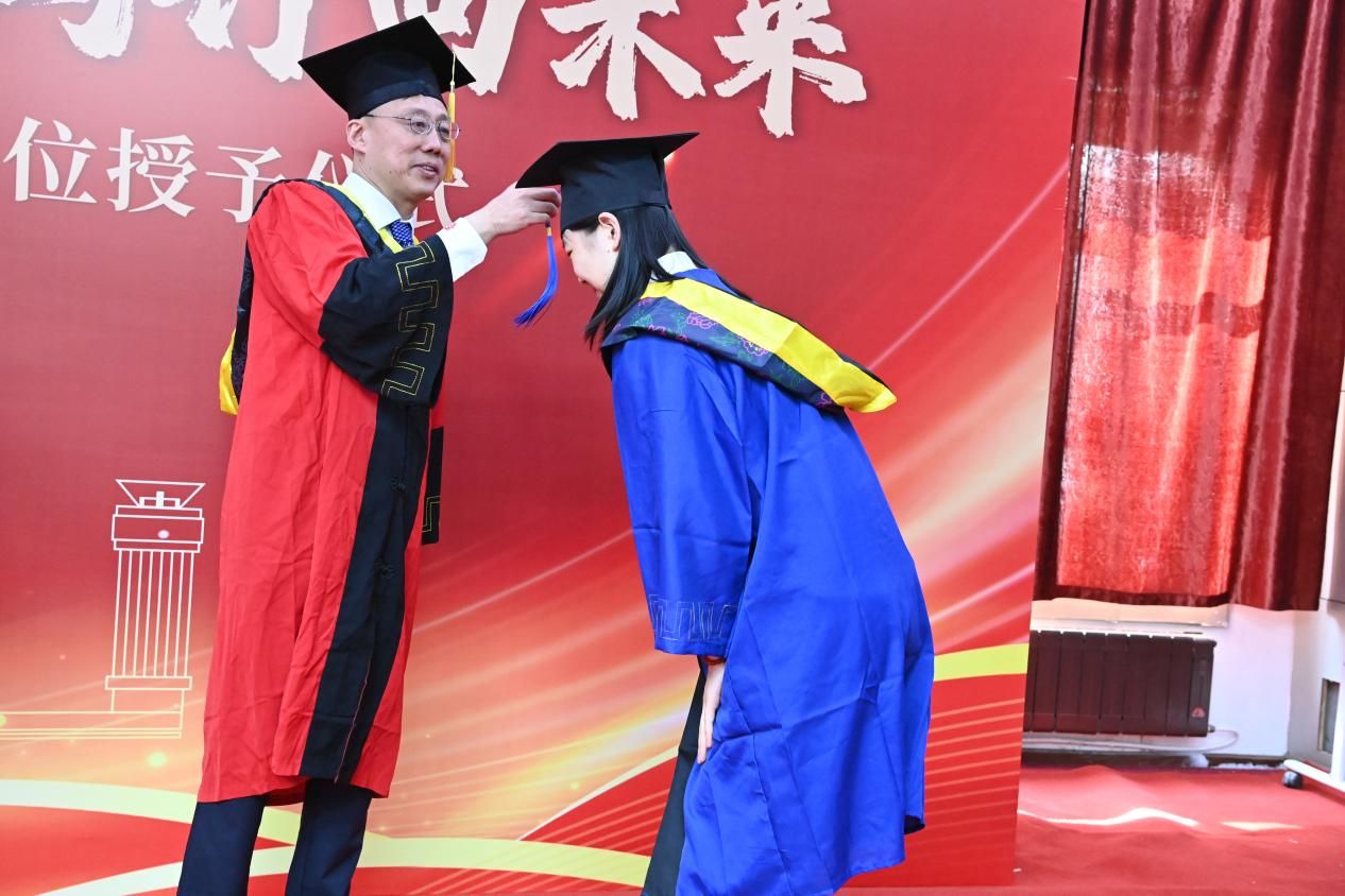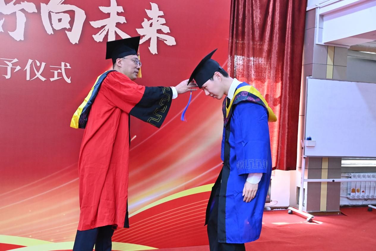 导师代表杜晓旭教授登台致辞,他深情回顾了与学生们共同走过的两年半时光,感慨良多,并激励学子们继续不断追求卓越、勇攀高峰。杜晓旭说,学生们在求学过程中取得的进步让人瞩目,他们将是社会的栋梁之材,他们将肩负起建设祖国的重任。