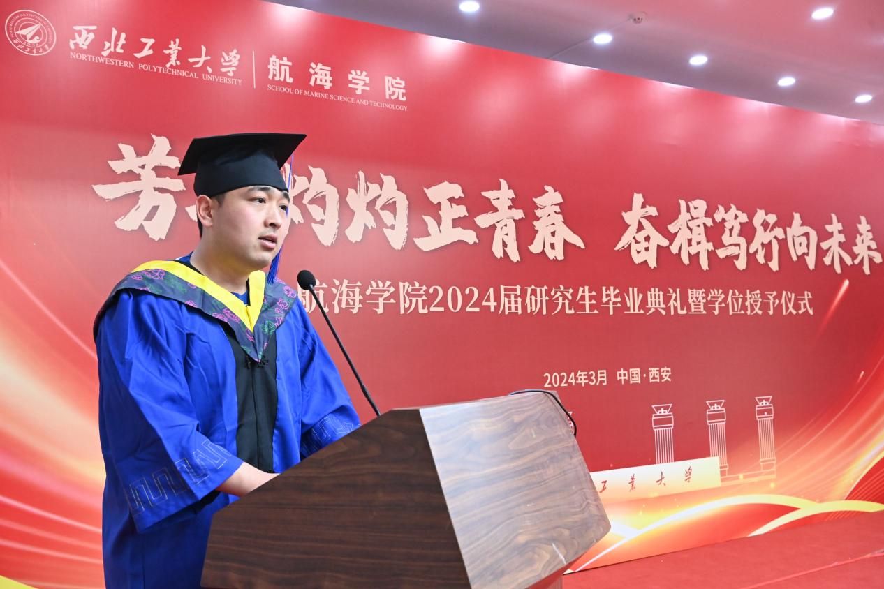 优秀毕业生陈子崇代表2024届毕业研究生上台发言。他用真诚的语言表达了对师长的感恩之情、对校园生活的美好回忆以及对未来的美好憧憬。陈子崇说,学院的培养让他们受益终生,他们将以更加饱满的热情投身到社会建设当中,为实现中华民族伟大复兴的中国梦而努力奋斗。