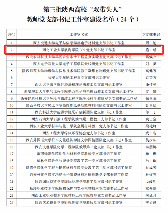 近日,中共陕西省委教育工委公示了第三批陕西高校“双带头人”教师党支部书记工作室建设名单,新葡萄8883官网AMG官网305党支部书记工作室成功入选建设名单。这是305党支部继2022年获批“全国党建工作样板支部”后,获得的又一殊荣。该支部的成功入选充分展示了近年来学院在校党委的坚强领导下,扎实推进教师党支部“双带头人”培育工程,坚持“政治强、业务强、合力强”标准,不断提升党支部书记“胜任力、凝聚力和战斗力”,着力打造一支党建和业务双融合、双促进的党支部书记队伍的丰硕成果。