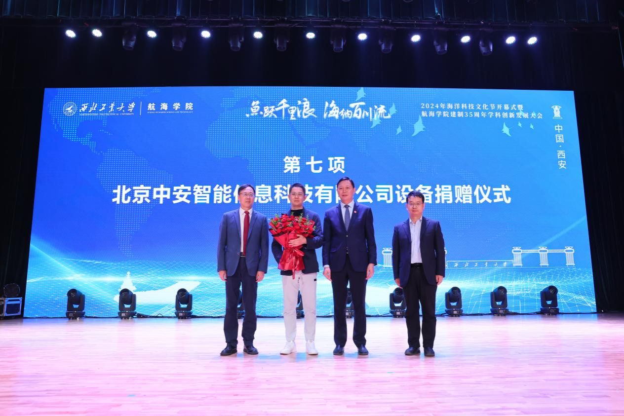北京中安智能信息科技有限公司总经理陆桦捐赠实验室设备用于支持学院发展。张开富、潘光、杨铭接受捐赠。