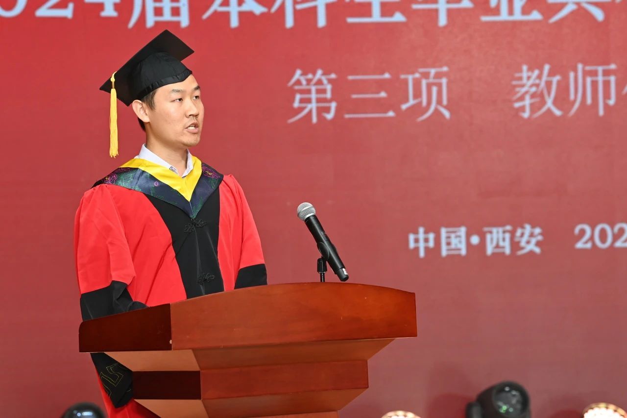 杜鹏作教师代表发言。面对同学们即将迎来的人生新阶段、新挑战,他分享了“聚焦、务实、与人为善”三点经验,并给出了一点建议——尽早独立自主,找到自己的赛道,开足马力,纵横驰骋,以盼顶峰相会。