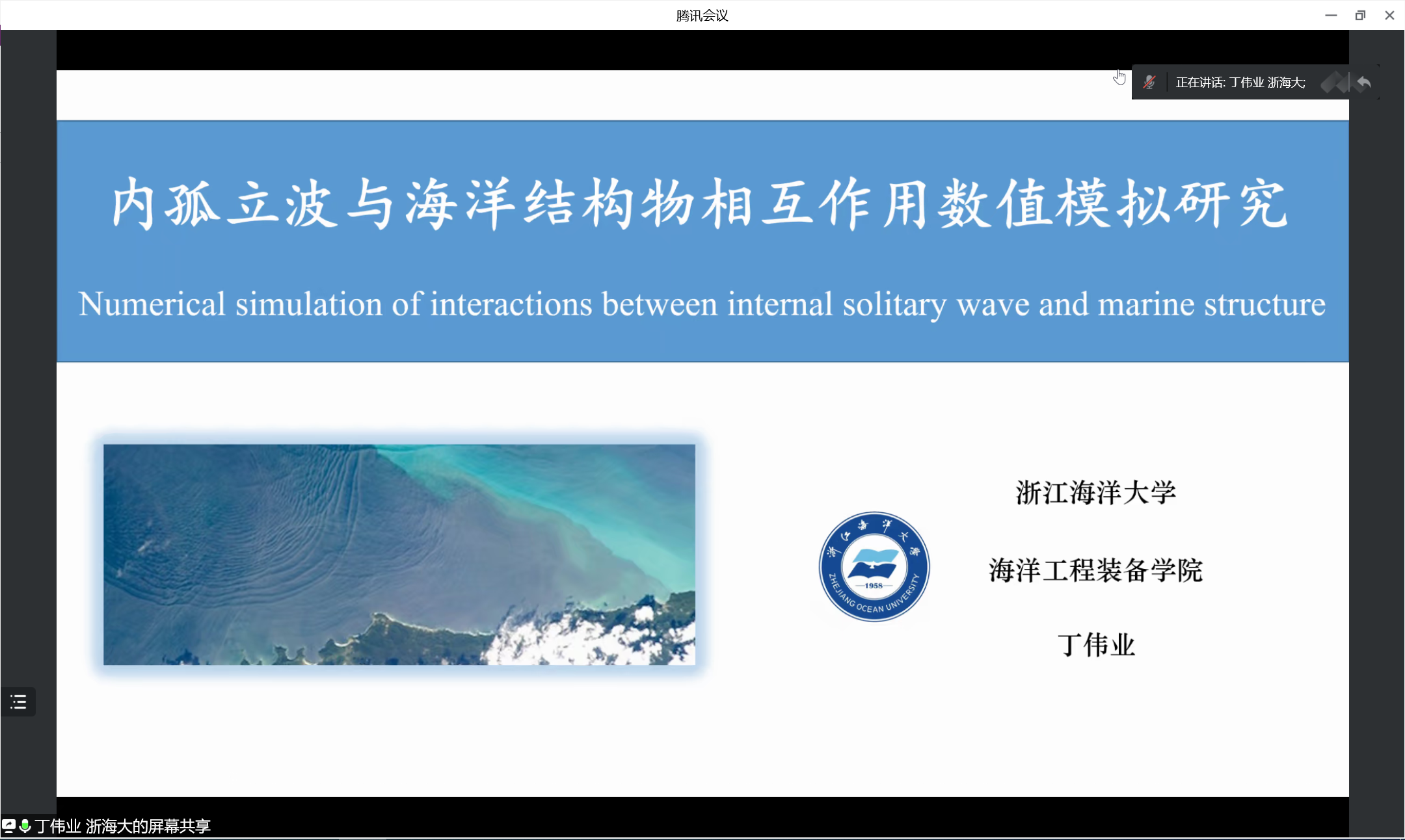 2022年6月15日,浙江海洋大学海洋工程装备学院丁伟业副教授应新葡萄8883官网AMG官网杜鹏副教授的邀请,在线上为师生作“航海大讲堂”系列讲座(二十二)——《内孤立波与海洋结构物相互作用数值模拟研究》学术报告。会议由杜鹏副教授主持,新加坡国立大学、浙江海洋大学、本校新葡萄8883官网AMG官网等校内外师生参会。