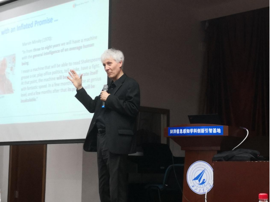 Knoll教授首先介绍了从显微镜到图灵等一系列人脑研究的科技里程碑事件。紧接着,作为HBP的SP10神经机器人平台负责人,Knoll教授详细介绍了该机器人平台的研发最新成果、相关实验影响资料、机械运行原理以及未来产业化方向等。同时,教授还介绍了运用嵌入式控制性闭环系统的神经机器人项目、类人机器人项目等。报告结束后,院长潘光代表新葡萄8883官网AMG官网向Knoll教授赠送纪念品,共同探讨招收联合培养博士生和进一步开展科研合作等事宜。