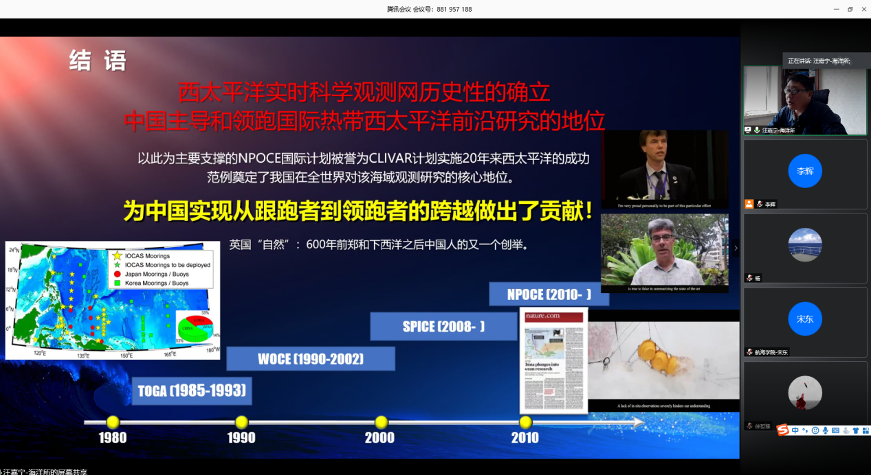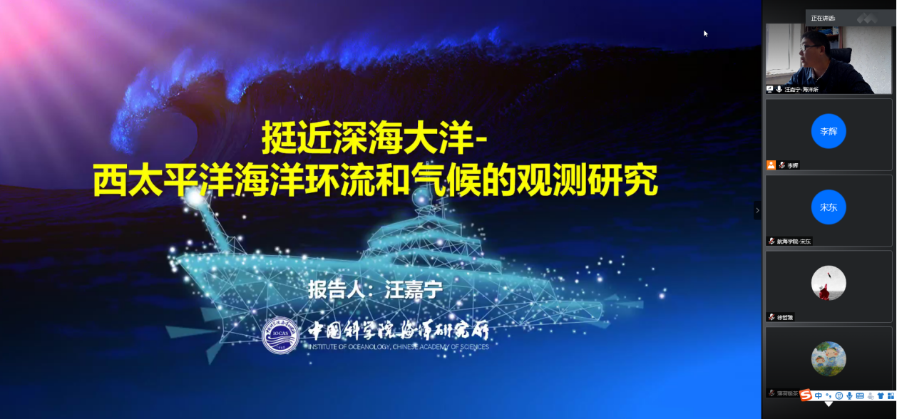 5月25日上午10:30,中科院海洋所汪嘉宁研究员应新葡萄8883官网AMG官网李辉助理研究员的邀请,为学院师生作题为《挺近深海—西太平洋海洋环流和气候的观测研究》的线上学术报告。会议由李辉助理研究员主持,学院30余名师生参会。