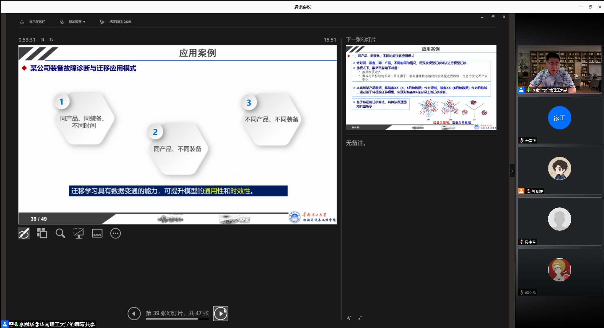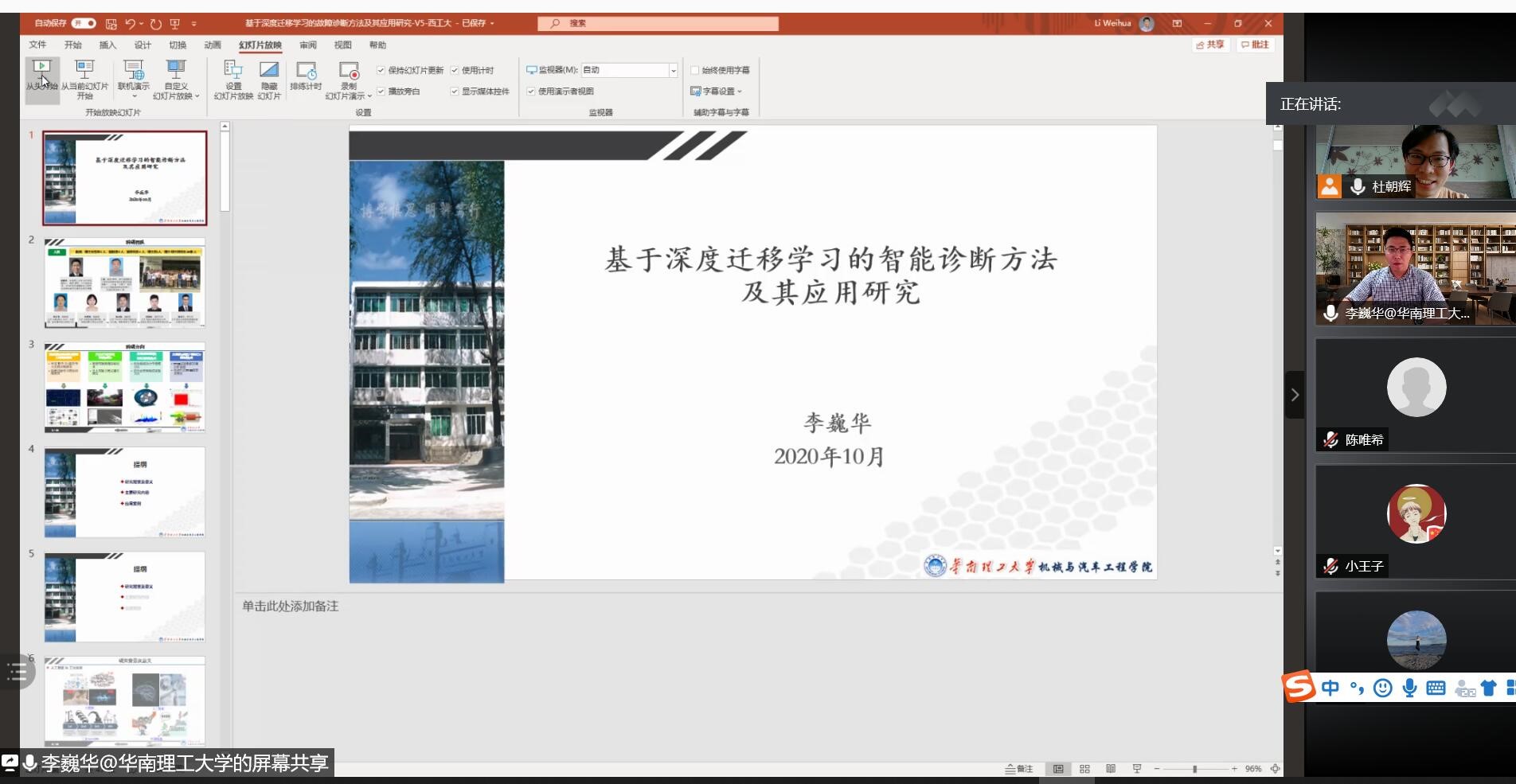 10月14日下午15:30,华南理工大学李巍华教授应新葡萄8883官网AMG官网杜朝辉老师的邀请,为学院师生作了题目为《基于深度迁移学习的智能诊断方法及其应用研究》的线上学术报告并展开了深入研讨交流。会议由杜朝辉主持,学院30余名老师和学生参加了此次报告会。