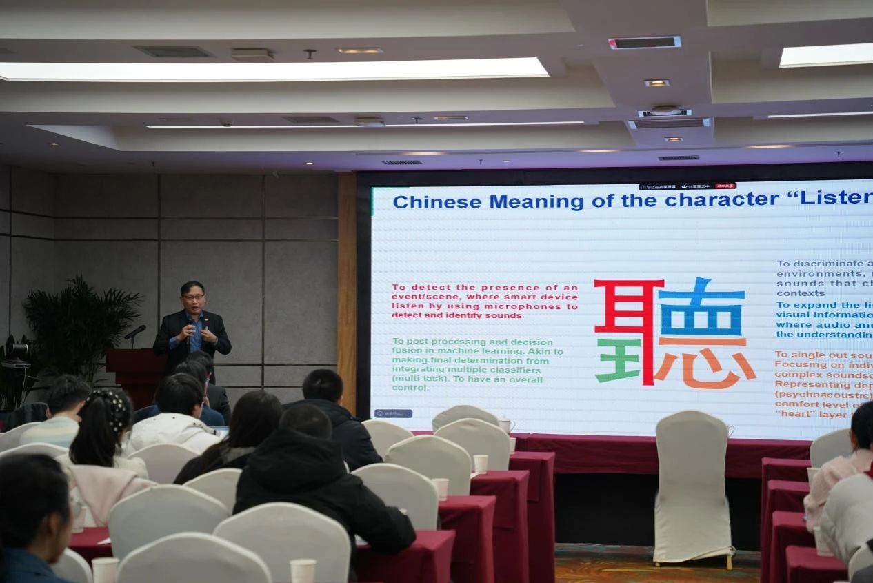 Gan教授在报告中深入讲解了智能声感知技术,包括声信号的感知与特征提取、声事件的检测与分类、用于家庭住宅与城市噪声管理的主动噪声控制技术、“声学香水”技术,以及声事件数据库的构建与标注方法等。报告内容丰富且精彩,引发了听众的热烈反响。