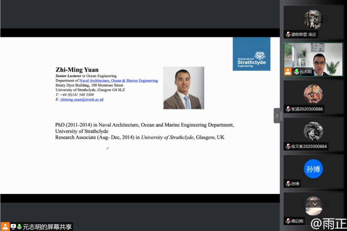 2022年7月4日至7月15日,新葡萄8883官网AMG官网暑期国际学堂课程《Dynamics of Ocean Engineering(海洋工程动力学)》顺利开展。课程由来自英国斯克莱德大学的元志明博士授课,课程历时两周,新葡萄8883官网AMG官网杜鹏老师为校内联系人。