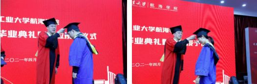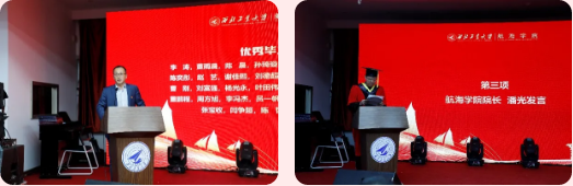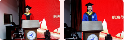 之后,导师代表陈捷、学生代表孙琦璇分别进行了发言。陈捷代表全院教师勉励2021届毕业生,希望大家以后面对困难要不断坚持,永不放弃,在今后的工作和生活中努力成长为一名坚持真理、崇尚科学的科研工作者,做一名合格的社会主义建设者。孙琦璇代表全体毕业生发言,她说出了毕业生的心声,讲述了对工大以及恩师的感激与不舍,并再次感谢学院老师的辛勤培养和全方位的指导。每一位航海学子都应该发扬学院优良传统,同时要心怀两个大局:思想上要深刻领悟世界百年未有之大变局,行动上要积极服务祖国现代化建设的大格局,以此传承一代代航海人的家国情怀和历史担当。
