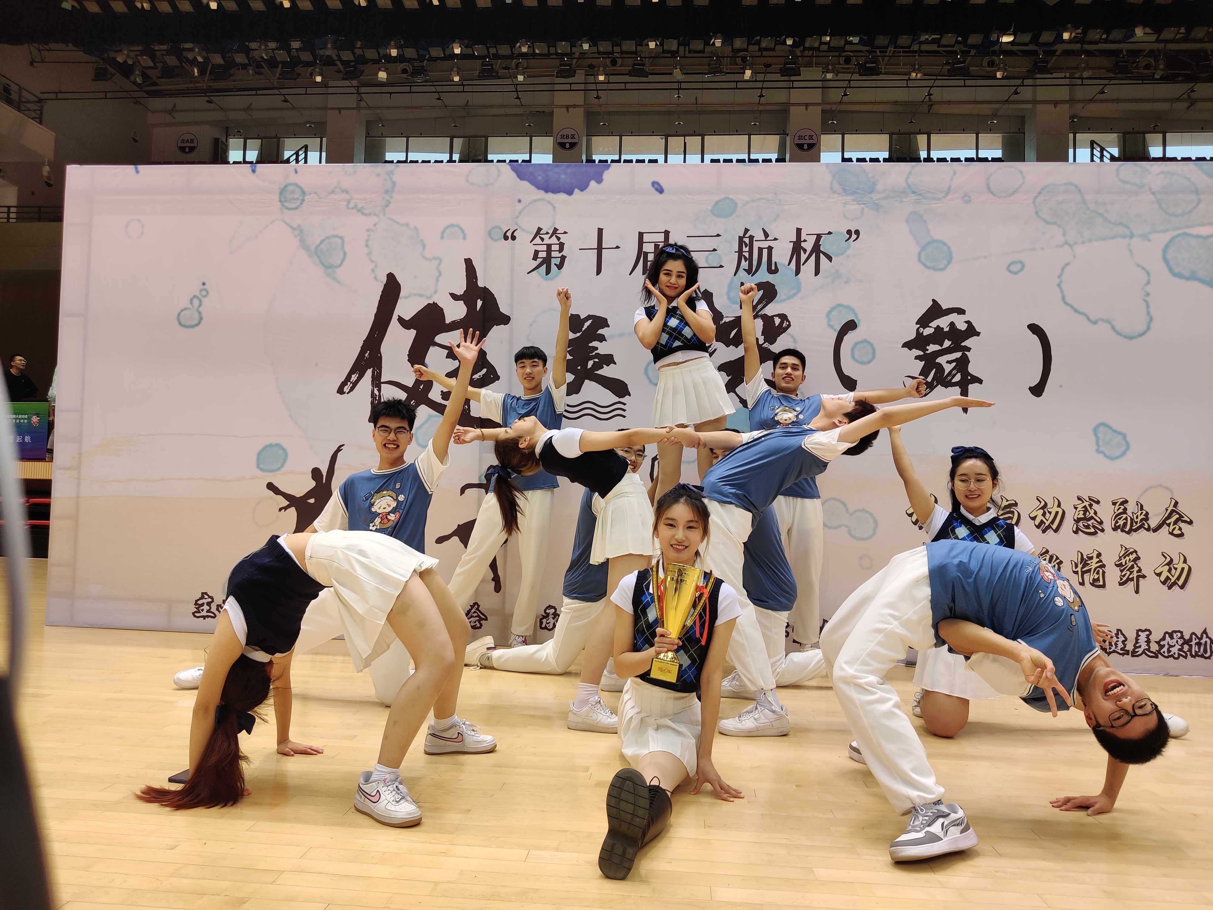 12月5日15:00,新葡萄8883官网AMG官网2021年“三航杯”健美操(舞)比赛于长安校区翱翔体育馆拉开帷幕。新葡萄8883官网AMG官网健美操代表队由队长乔巍和孙雅婷带领10位海洋工程大类20级和21级学生组成。本届新葡萄8883官网AMG官网健美操队于11月中旬完成人员选拔并开始了赛前训练,经过三周的训练,克服寒冷和种种困难,最终在舞台上展示最佳风采,以极高的完成质量获得了评委老师的一致高分,在12个学院代表队的激烈比拼中脱颖而出,斩获冠军。