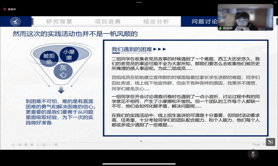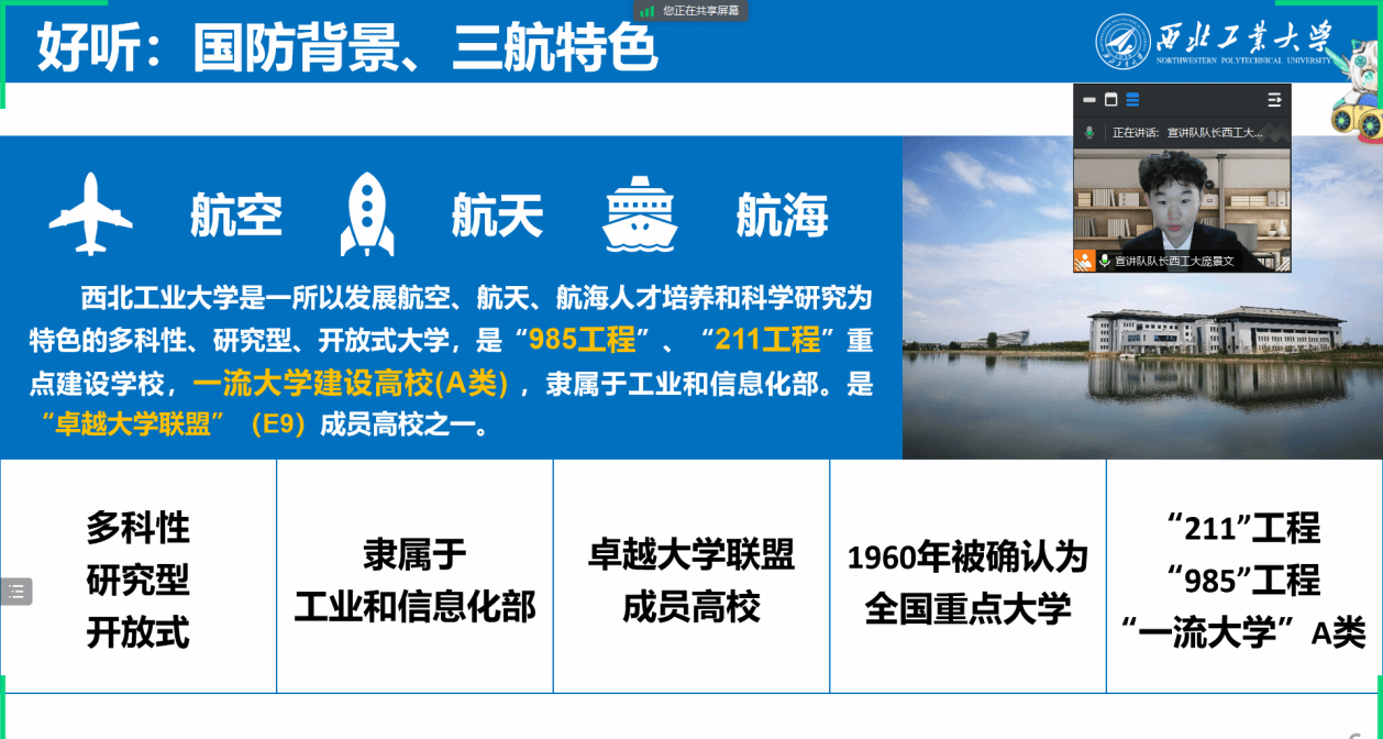 2024 年1月30日,在前期材料整理、目标学生宣传的基础上,实践队进行了线上招生宣讲。实践队同学分别向参与者介绍了西工大优势、西工大老党员故事和高三复习方法等内容。这次活动加强了实践队同学们高中母校学生及家长对新葡萄8883官网AMG官网的了解,在高中同学们心中埋下了未来投身国防建设的种子,也锻炼了团队成员的语言表达能力。