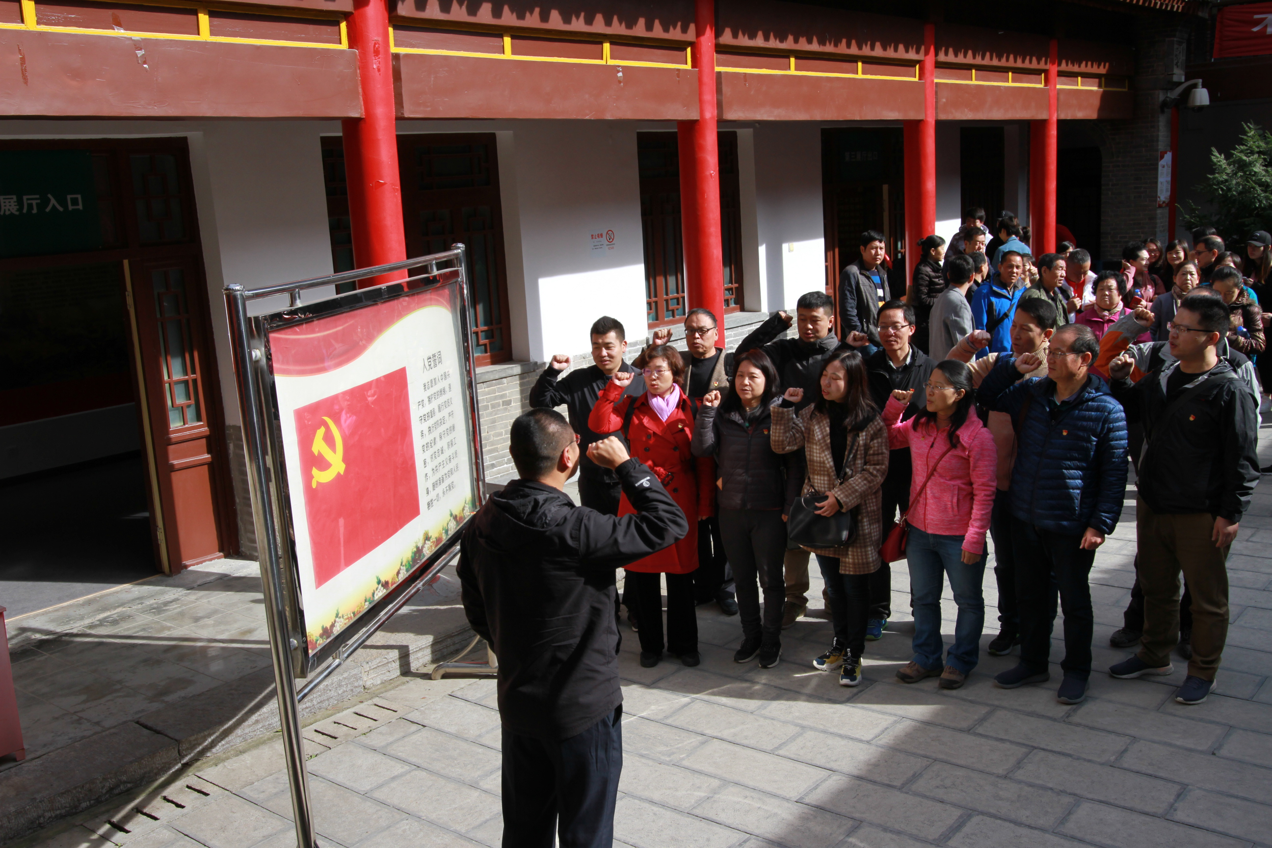 参观学习结束后,在鲜红的党旗下,副院长崔荣鑫领誓,全体党员在党旗下庄严宣誓,重温入党誓词,不忘入党初心。