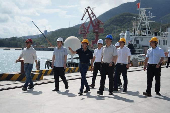 老师们先后参观南山港科考船码头、崖州湾科技城和龙鲸001号船。在某重点项目总装总调现场,项目团队的师生不惧风吹日晒,在南海高温、高湿、高盐、高腐蚀的海洋环境下,身着工作服,头戴安全帽,全神贯注地投入到实验工作中,用汗水诠释“敢为人先 攻坚克难 团结协作 无私奉献”的航海精神。站在龙鲸001号船前,看着巨轮轮廓和项目阶段性成果,学院一行真切感受到项目海试的意义和技术验证突破的威力,亲身体验到项目一线师生向深蓝远海进军,加快建设海洋强国的奋斗历程。