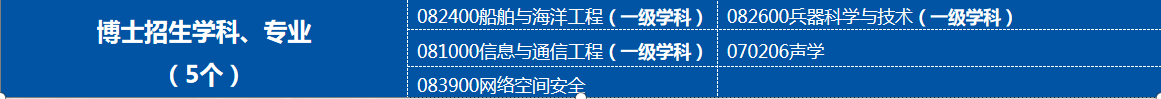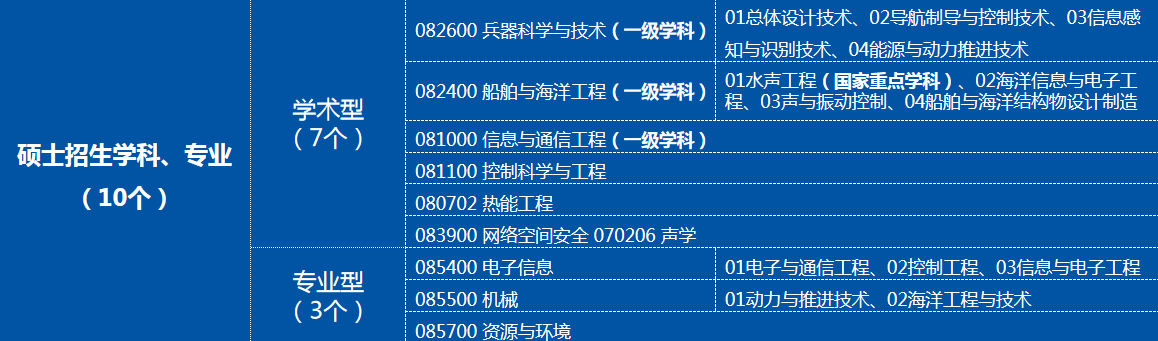 新葡萄8883官网AMG官网硕士招生学科专业10个(7学术型、3个专业型)、博士招生学科专业6个,设兵器科学与技术、船舶与海洋工程、信息与通信工程3个一级学科博士学位授权点和声学、网络空间安全2个二级学科博士学位授权点,其中武器系统与运用工程和水声工程是国家重点学科。