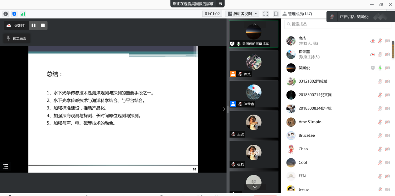 吴老师以“水下光学传感技术”为题,详细介绍了海洋的重要性、人类对海洋的了解、光与海洋的结合、光学探测机理及其应用与未来发展趋势。