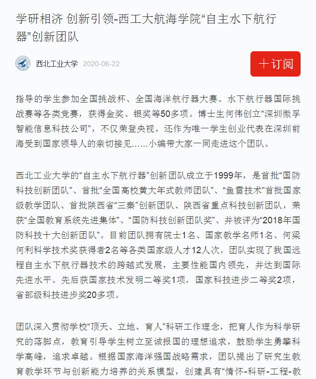 新葡萄8883官网AMG官网“自主水下航行器”创新团队成立于1999年,长期从事新型水中兵器、水下航行器基础理论和核心技术攻关、工程型号研制以及人才培养工作。该团队是首批“国防科技创新团队”、首批“全国高校黄大年式教师团队”、“鱼雷技术”首批国家级教学团队、首批陕西省“三秦”创新团队、陕西省重点科技创新团队,荣获“全国教育系统先进集体”、“国防科技创新团队奖”、并被评为“2018年国防科技十大创新团队”。