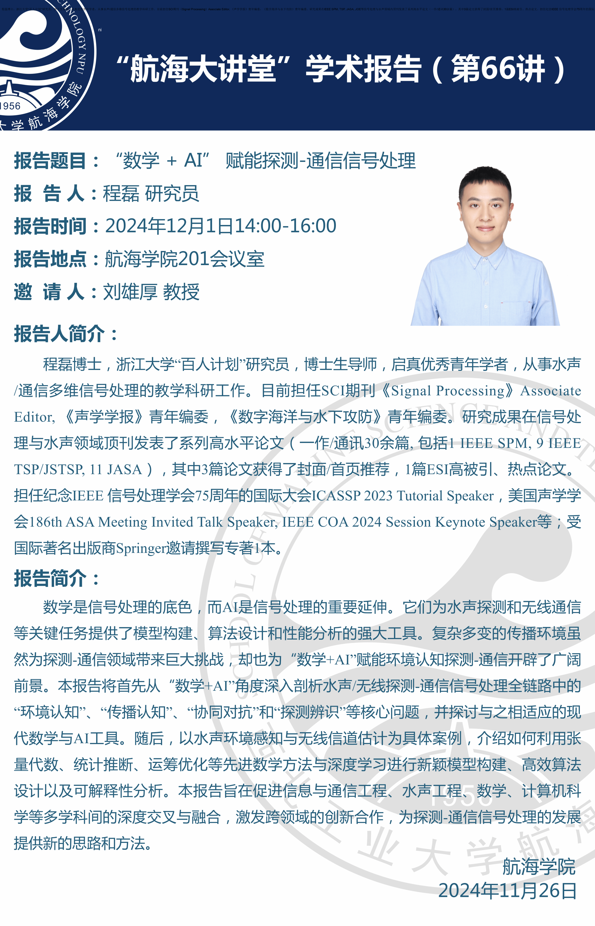 Zhejiang University's "Hundred Talents Program" researcher Cheng Lei was invited to give a special academic report on "Mathematics + AI Empowering Signal Processing for Detection and Communication"...